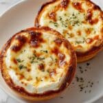 Two round, golden-brown cheese tarts sit side by side on a white plate, each with three visible layers: a thin, crispy light brown crust at the bottom, a thick middle layer of white, crumbly cheese, and a top layer of melted, glossy cheese with browned spots and a slightly bubbly texture. Small green herb pieces are sprinkled on the top, adding a pop of color. The plate is on a white marbled surface, creating a clean and elegant setting. photo taken with an iphone --ar 4:5 --v 7