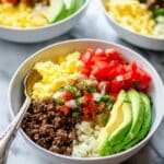 These Loaded Breakfast Taco Bowls are a flavorful, hearty, and low-carb breakfast option featuring seasoned ground beef, fluffy scrambled eggs, spicy cauliflower rice, and fresh toppings like avocado, cherry tomatoes, and homemade salsa. Perfect for a protein-packed start to your day with bold Mexican-inspired flavors.